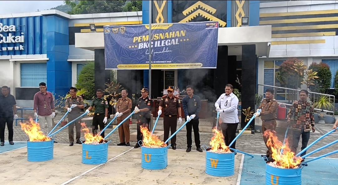 Gerbang Sulawesi _ Direktorat Jenderal Bea dan Cukai bersama seluruh jajaran Pimpinan Daerah Kabupaten Banggai dan aparat TNI Polri melaksanakan pemusnahan Barang yang menjadi milik negara (BMMN) berupa rokok ilegal yang merupakan hasil penindakan bersama KPPBC tipe madya pabean C Luwuk, Pemerintah Daerah, TNI Polri Selasa (25/11/2025).